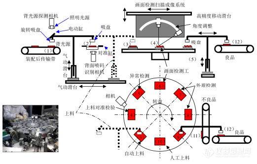 系统组成与关键零部件单元可用图2示意图来清晰地描述,它由精密传输机构、光源、相机阵列、显微复检、并行处理、控制、主控计算机、服务器等单元模块,以及与工厂数据中心互联的工业局域网组成。图 3 展示了我们开发的手机液晶显示屏背光源模组缺陷转盘式多工位视觉在线检测系统的结构组成,该检测系统包括自动上料、编码、对准、检测、分选、返修识别等几个部分。